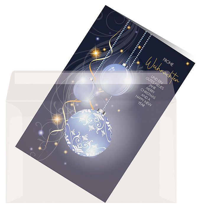 Es handelt sich um eine Doppelkarte im Format 19,0 x 12,0 cm auf 250 g/qm-Papier; Karte und Kuvert wiegen zusammen unter 20 g - für günstigen Briefversand.
